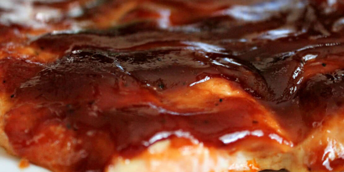 - Pour 1/2 cup bbq sauce covering the whole salmon and spread around with a spoon.