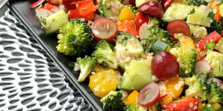 This is the perfect salad for summer when peppers, cucumbers and radishes are growing plentiful in gardens and can be found in every farmers market. The chopped broccoli, sunflower seeds and hemp seeds add real staying power to fill you up without filling you out! And, I love the addition of red seedless grapes for a little sweetness.
